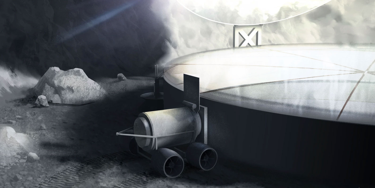 Neste projeto proposto, os espelhos usariam a luz solar para aquecer a água do gelo no solo lunar. O vapor d’água seria transferido para tanques laterais.